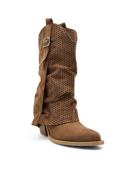 Ako tražite obuću koja je i moderna i prozračna, naši modeli rupičastih letnjih čizama od prevrnute kože biće vam pun pogodak. Zahvaljujući rupicama, ove čizme omogućavaju koži da diše i pružaju vam potrebnu svežinu čak i tokom najtoplijih dana. A lagan đon čini da vam bude udobno i kada ste ceo dan na nogama. Prevrnuta koža im daje taj opušteni, boho šik izgled, te savršeno idu uz lepršave haljine, šortseve ili lagane pantalone.