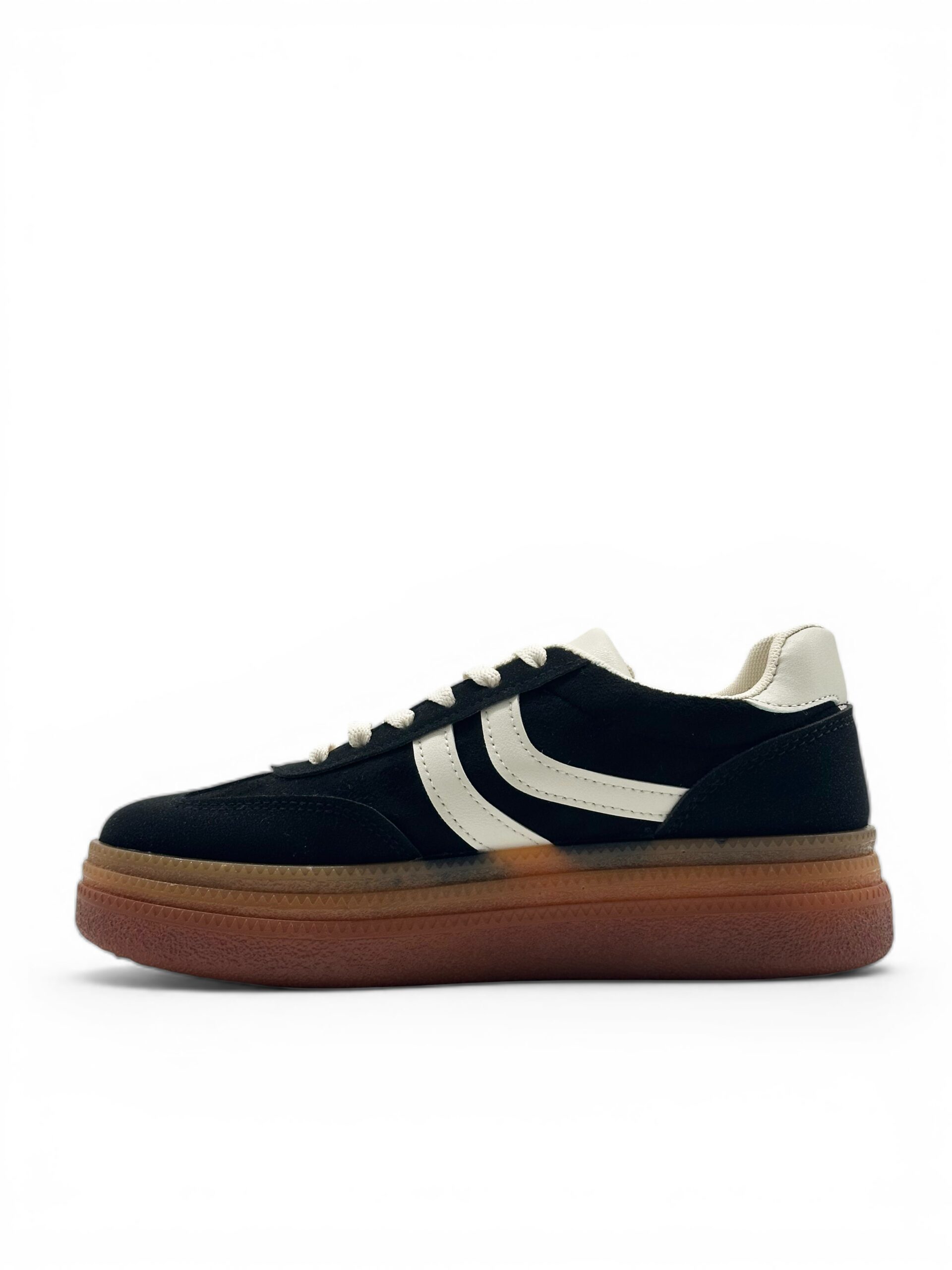 Ove crne patike sa platformom i dve istaknute bočne bele linije savršen su izbor za žene koje vole sportsko-elegantni stil. Jednostavne, a opet pečatljive, lako se kombinuju uz različite komade garderobe. Troslojni đon pruža dodatnu udobnost i stabilnost, tako da ih možete nositi tokom celog dana bez napora. Idealne su uz farmerke, suknje, haljine, šorceve ili kežual kombinacije, a posebne bočne linije daju im urban i trendi izgled.